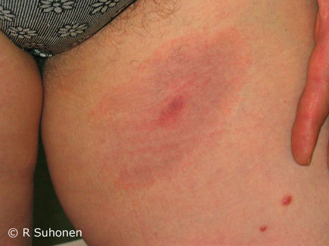 Erythema migrans on the thigh.Borrelia infection, or erythema migrans, presented here as a still reddened blotch with a distinct active edge. It should be borne in mind that the transmission of Borrelia bacteria most commonly occurs via a nymph tick that is only about 1 mm in size and therefore often goes undetected. A negative tick history is therefore unreliable.