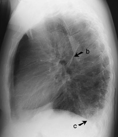 Interstitial oedema in the lungs (lateral view). Interstitial oedema in the lungs (lateral view). Oedema is also accumulated along the lobe margins (b) and in the scars. The condition is often associated with pleural fluid (c). For PA view: see Interstitial Oedema in the Lungs (Pa View).