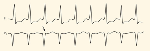 Supraventricular tachycardia (SVT). The QRS complex is narrow and the ventricular rate is regular 185/min. In this case it is about atrioventricular nodal re-entrant tachycardia and a retrograde P wave is seen immediately after the QRS complex in the lead V1 (arrow). Note also the alternation in the shape of the QRS complex which is connected with the rapid ventricular rate. Supraventricular tachycardia starts and stops abruptly.