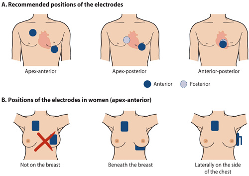 Electrical cardioversion. The electric current is best conducted through the heart if one of the defibrillator electrodes is positioned at the back of the patient (apex-posterior or anterior-posterior). If there is no such electrode available, it is recommended that one electrode is positioned at the apex of the heart and the other one up on the right side of the sternum (apex-anterior). In women, the electrode must not be positioned on the breast. Sufficient amount of conducting paste should be applied on the electrodes. Hand-held electrodes should be pressed on the skin with sufficient force. A biphasic defibrillator is used to perform cardioversion and the device's maximal energy is used already in the first cardioversion shock. A new cardioversion attempt can be performed immediately, as soon as the patient's blood pressure and atrial fibrillation rhythm have stabilized, i.e. in practice about one minute after the previous attempt. When cardioversion is performed in a patient with a pacemaker, the electrodes are positioned so that the axis between them is perpendicular to the axis between the pacemaker and the apex of the heart. In patients with an implantable cardioverter defibrillator, cardioversion is safest to perform by programming the device to give a synchronized intracardiac shock while the patient is under light anaesthesia. If this is not successful, cardioversion is performed like in a patient with a pacemaker. Picture source: .