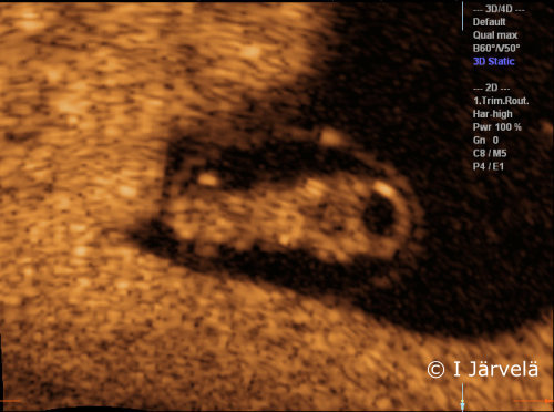 Pregnancy week 7 (ultrasound scan). The embryo in the amnion sac (AS) in the 7th week of pregnancy. The fourth cerebral ventricle in the fetal head, as well as the limb buds are detectable.