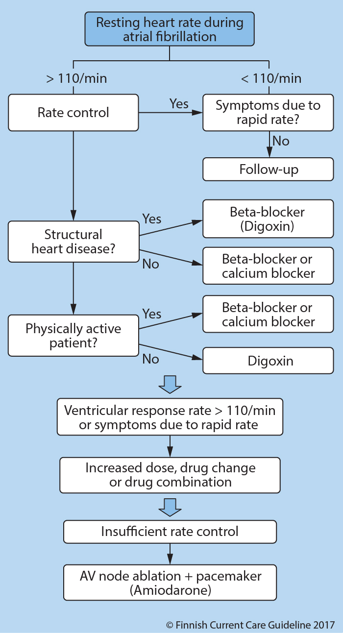 Rate control in permanent atrial fibrillation.Medication used for slowing down the ventricular response rate is chosen and the dose adjusted individually, so that the patient is symptomless. The minimum target in asymptomatic patients is ventricular rate at rest below 110/min. Stricter rate limits are applied in symptomatic patients. In these patients, the target rate is 60-80/min at rest and 90-115/min on light exertion like walking. If one drug is not sufficient, a combination may be used. If that is not effective either, the patient is referred for consultation to a cardiologist specialized in rhythmology in order to assess the feasibility of invasive treatment (pacemaker and atrioventricular node catheter ablation).