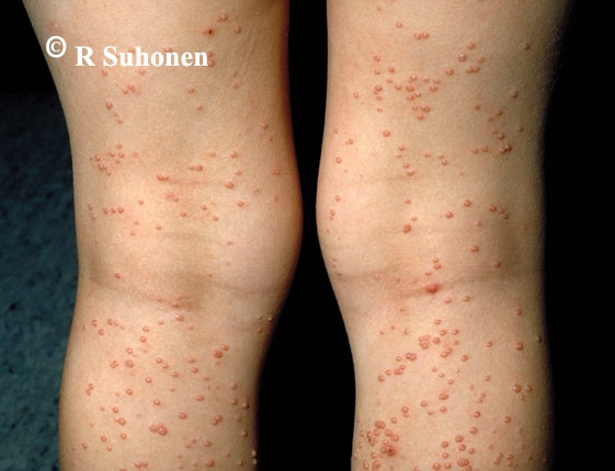 Mollusca contagiosa.Mollusca contagiosa are small papules caused by a virus. Large numbers of papules may occur particularly in atopic children. Mollusca resolve spontaneously.