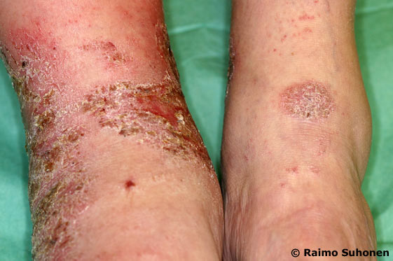 Infectious dermatitis on the ankles.Infectious eczematoid dermatitis presenting as crusty patches on the lower limbs. In the right foot, the skin is inflamed and the foot is swollen. In this case, the swelling is associated with the inflammation; in differential diagnostics, deep venous thrombosis should be kept in mind.