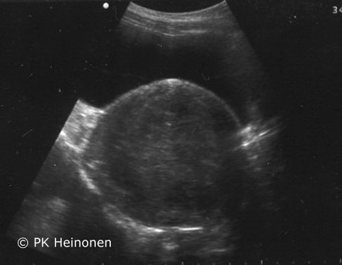 Myoma in ultrasonography. A large (10 cm) myoma in the anterior wall of the uterus behind the urinary bladder seen in abdominal ultrasonography. The myoma caused an acute urinary retention.
