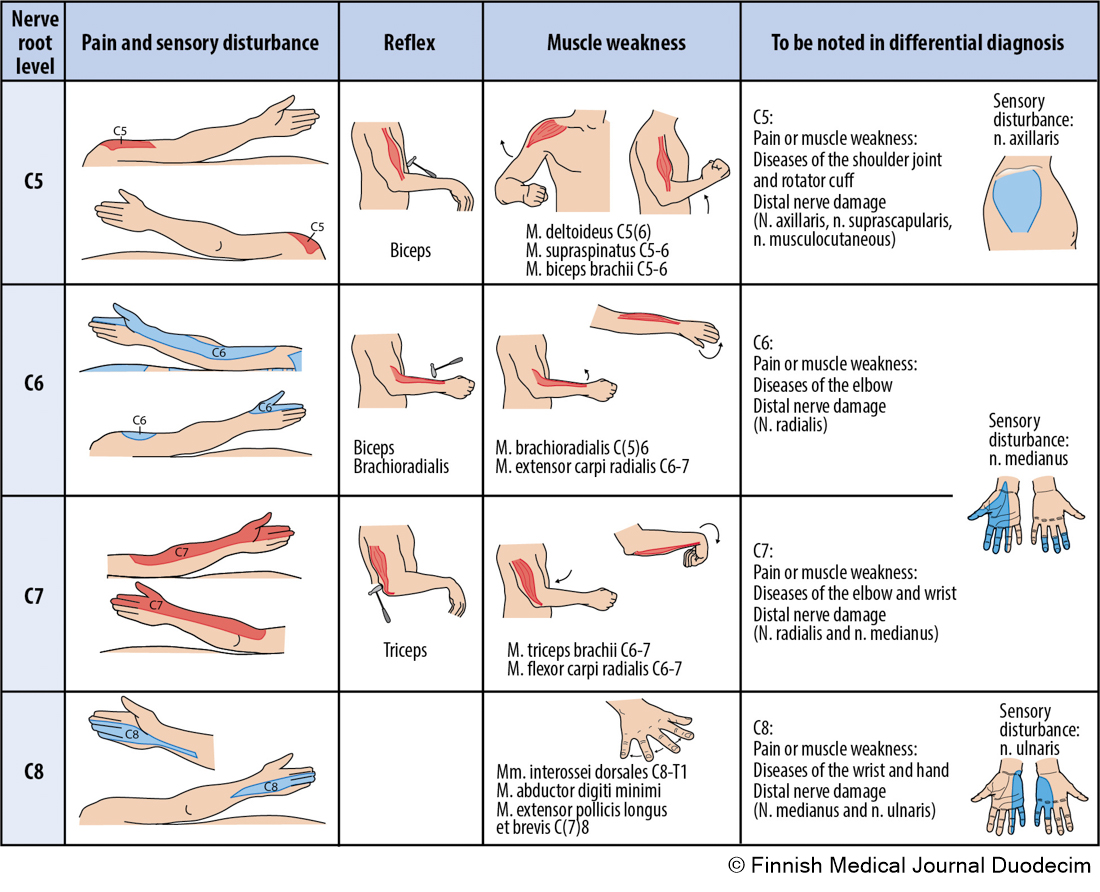 Picture modified from: Arokoski J, Karppinen J, Kankaanpää M et al. Examination of neck pain in adults. Finnish Medical Journal Duodecim2014;130(20):2099-107.