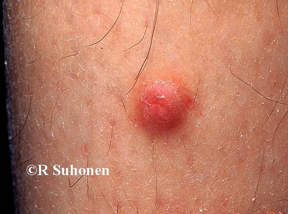 Dermatofibroma. Dermatofibroma (cutaneous fibrous histiocytoma) is a common, firm, sometimes mildly itching nodule on the skin of the trunk or a limb. Diffuse hyperpigmentation may occur around the outer border. Treatment (excision or cryotherapy) is not required for medical reasons.