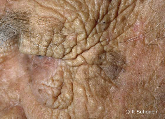 Solar elastosis. Elastosis as a result of long-term exposure to sunlight. There are deep furrows in the face and a slightly yellowish colour of the skin. In this patient, the change also includes black open comedones and light-coloured cysts, and this condition bears the name of Favre-Racouchot syndrome. The phenomenon is fairly common in elderly men and there is no treatment available for restoring the skin structure.
