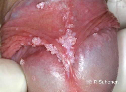 Condylomata acuminata on preputium.Condyloma acuminatum (genital warts) is a common viral infection of predominantly genital mucous membranes. The therapeutic alternatives are podophyllotoxin, various cauterization methods, cryotherapy and most recently imiquimod. Especially in female patients the condition may prove to be highly resistant to treatment.