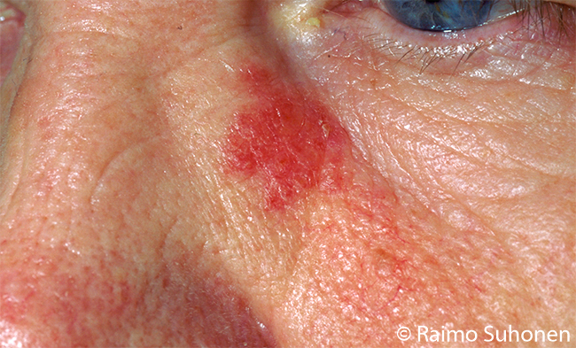 Solar keratosis. Solar keratosis usually is red and scaly. An easy diagnostic aid is a couple of weeks of glucocorticoid treatment: an eczema improves, the solar keratosis does not.