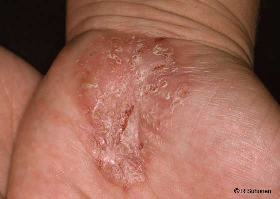Palmoplantar pustulosis (palms). The palmar changes in pustulosis vary in activity. Here the cloudy pustules on the palms have become dry and the skin is red and flaky.